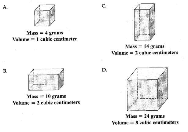 FOUR BLOCKS MADE OF DIFFERENT MATERIALS ARE SHOWN BELOW. WHICH BLOCK HAS THE GREATEST DENSITY?