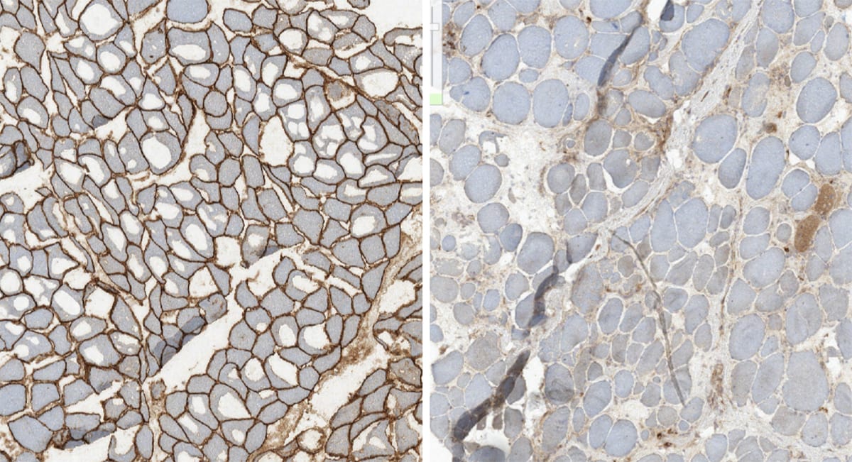 A 6-month-old infant presents with concerned parents. They have noticed the child is not lifting his head or rolling over. Upon evaluation, the child is noted to be hypotonic, significantly weak, and developing early signs of joint contractures. An MRI of the brain reveals significant cerebral dysgenesis. Which of the following defective proteins is most likely responsible for the infant's disorder?