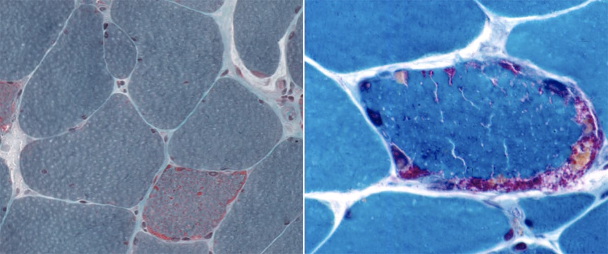 A 65-year-old man with a past medical history of hyperlipidemia on atorvastatin presents with progressive proximal muscle weakness over 6 months. Examination shows symmetric proximal weakness of the upper and lower extremities. Laboratory studies reveal a creatine kinase of 8,500 U/L. Muscle biopsy shows scattered deteriorating muscle fibers with minimal inflammatory infiltrate. Which of the following is the most likely diagnosis?