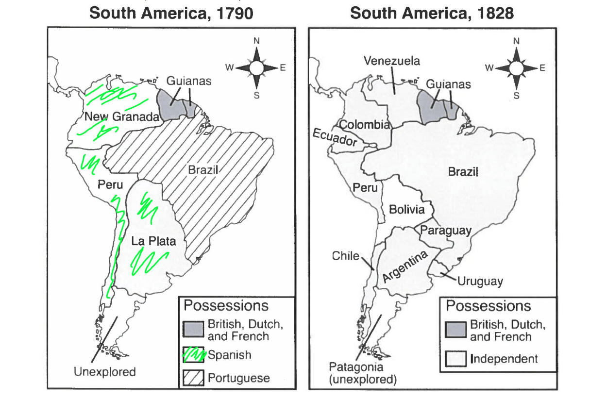 The large colonies owned by Spain and Portugal became independent. This happened because the people in South America fought revolutions against Spain and Portugal.