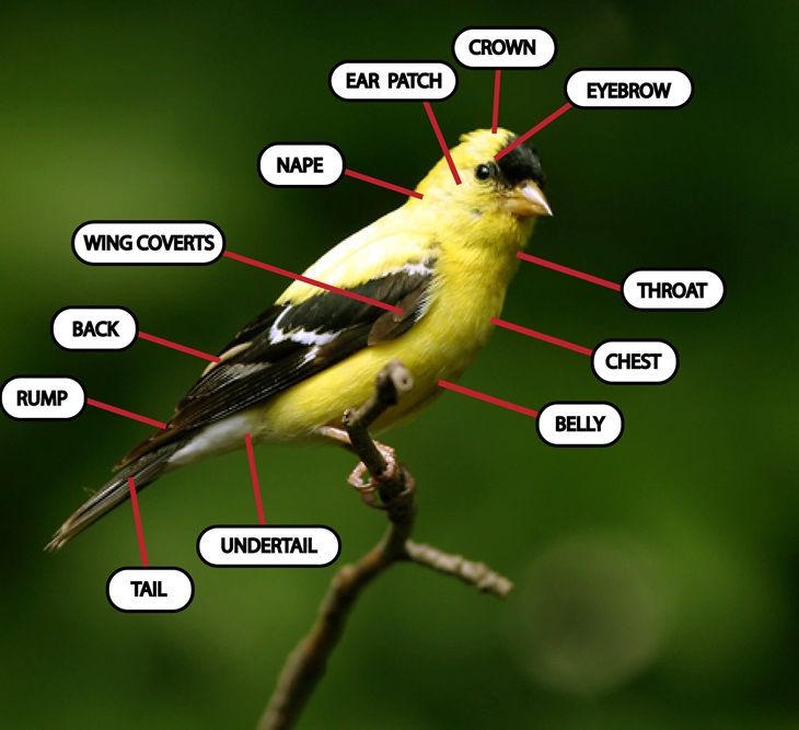 When identifying birds, you can observe distinct stripes, spots, patterns, colors, and highlights known as: