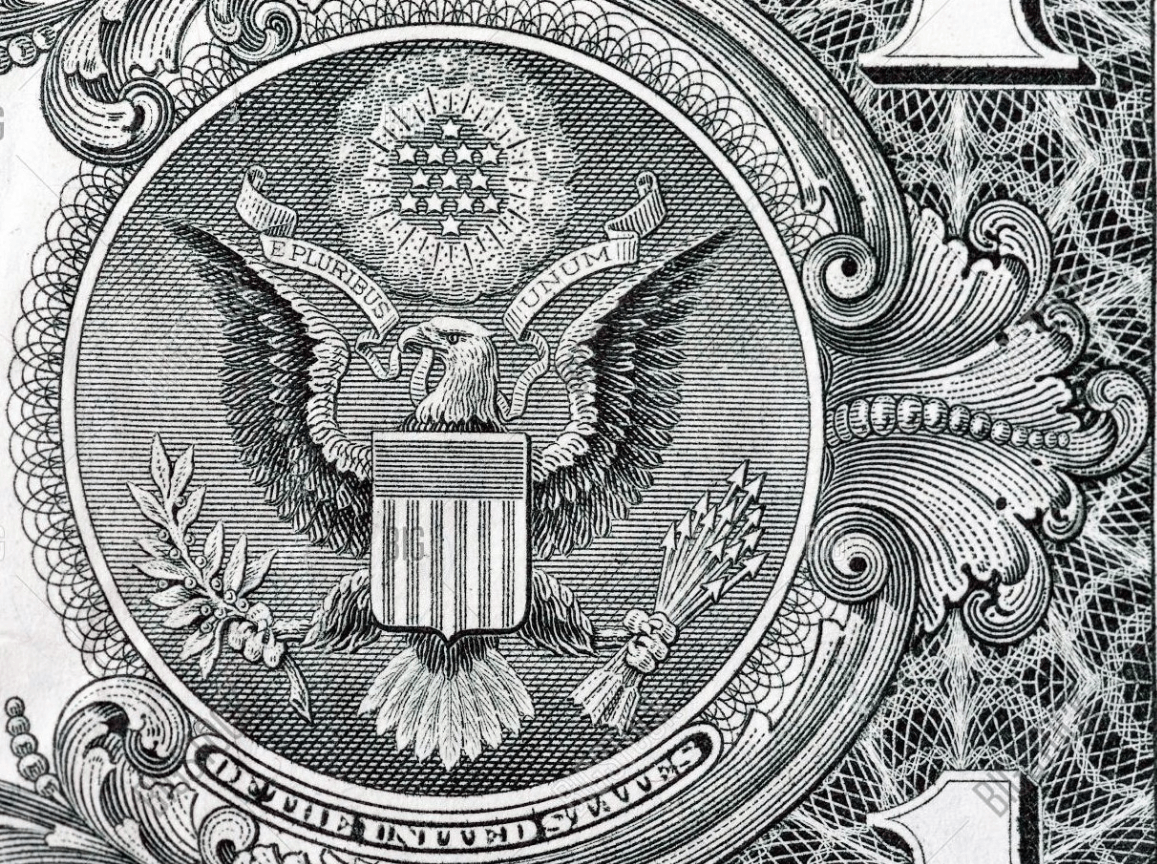 Symbolized on the back of the one dollar bill by a bald eagle clutching an olive branch in his right talon and thirteen arrows in his left talon