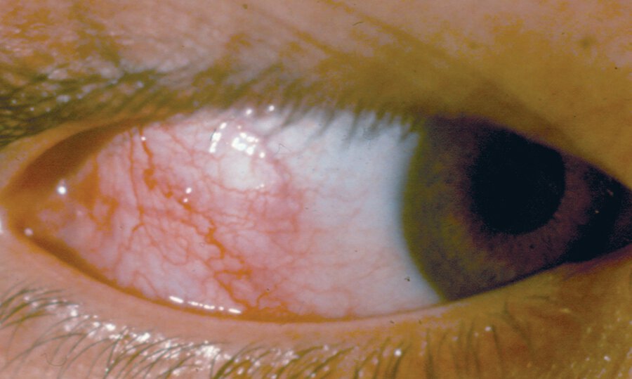 Patient presents with 1 day of redness, tearing, and irritation of R eye. Denies eye pain, photophobia, or change in vision. Her left eye is uninvolved. She has no other symptoms. Visual acuity is 20/20 in both eyes. Pupils are equally round and reactive to light and accommodation.