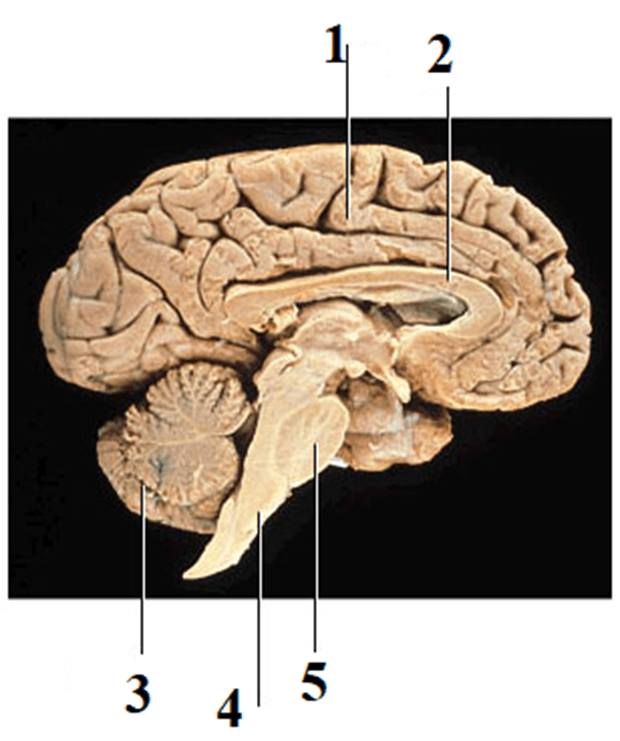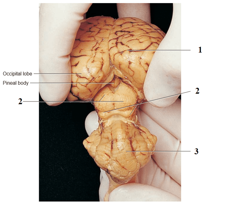 1) Cerebrum, 2) superior and inferior colliculi, 3) Cerebellum