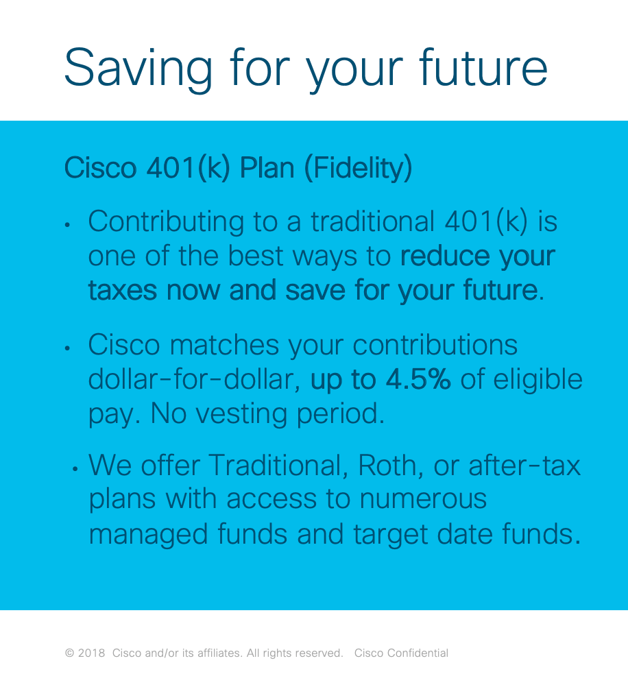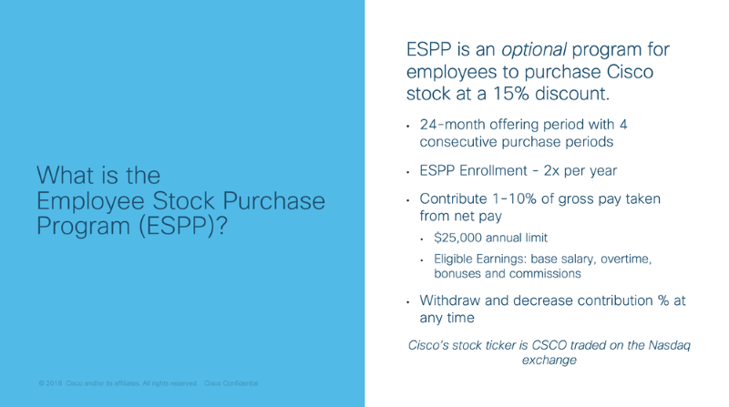 Contribute up to 10% of your bi-weekly gross pay to purchase Cisco stock at a 15% discount.