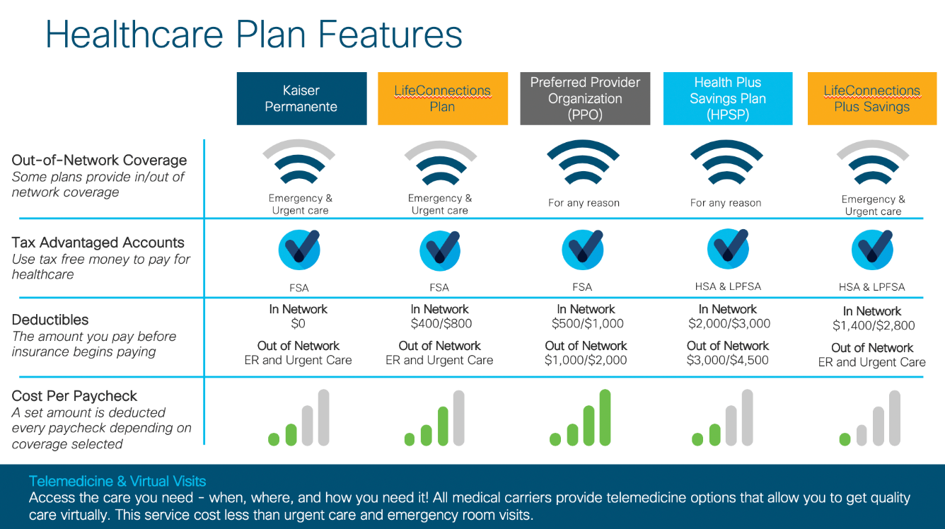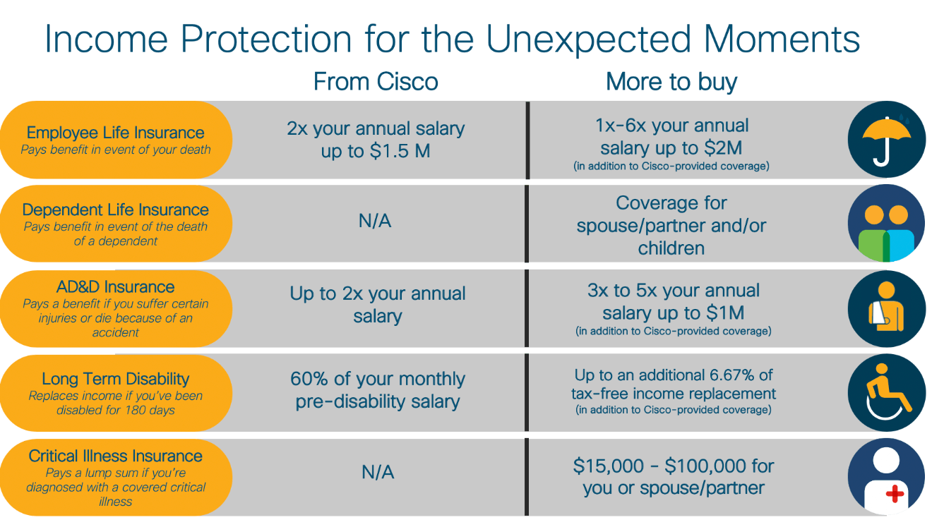 Cisco provides contributions and offerings to employee life insurance, dependent life insurance, accidental death & dismemberment, long term disability and critical illness insurance.