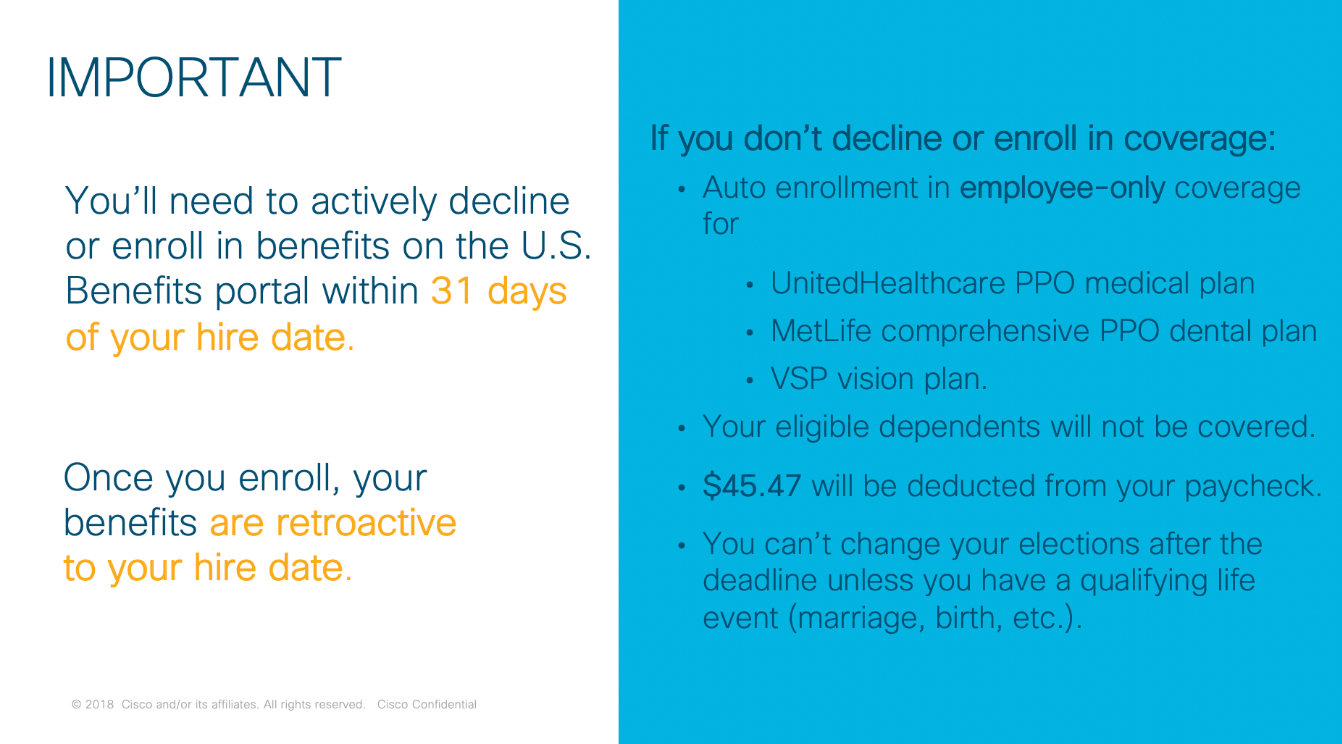 After 31 days you are automatically enrolled in healthcare plans and the cost is deducted from your paycheck.
