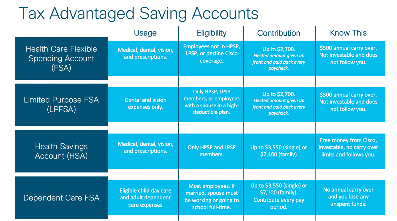 Flexible spending account (FSA), Limited Purpose FSA, Health savings account (HSA) and Dependent Care FSA.