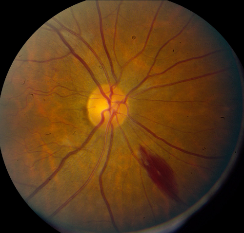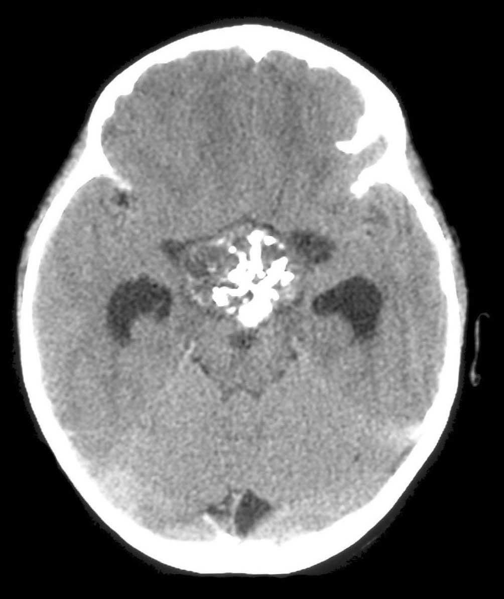 An 8-year-old boy is brought to the pediatrician because of headaches and impaired vision for the past 7 to 10 days. Neurologic examination reveals bilateral temporal visual field defects. The rest of the physical examination is unremarkable. A noncontrast CT scan of the head is shown.