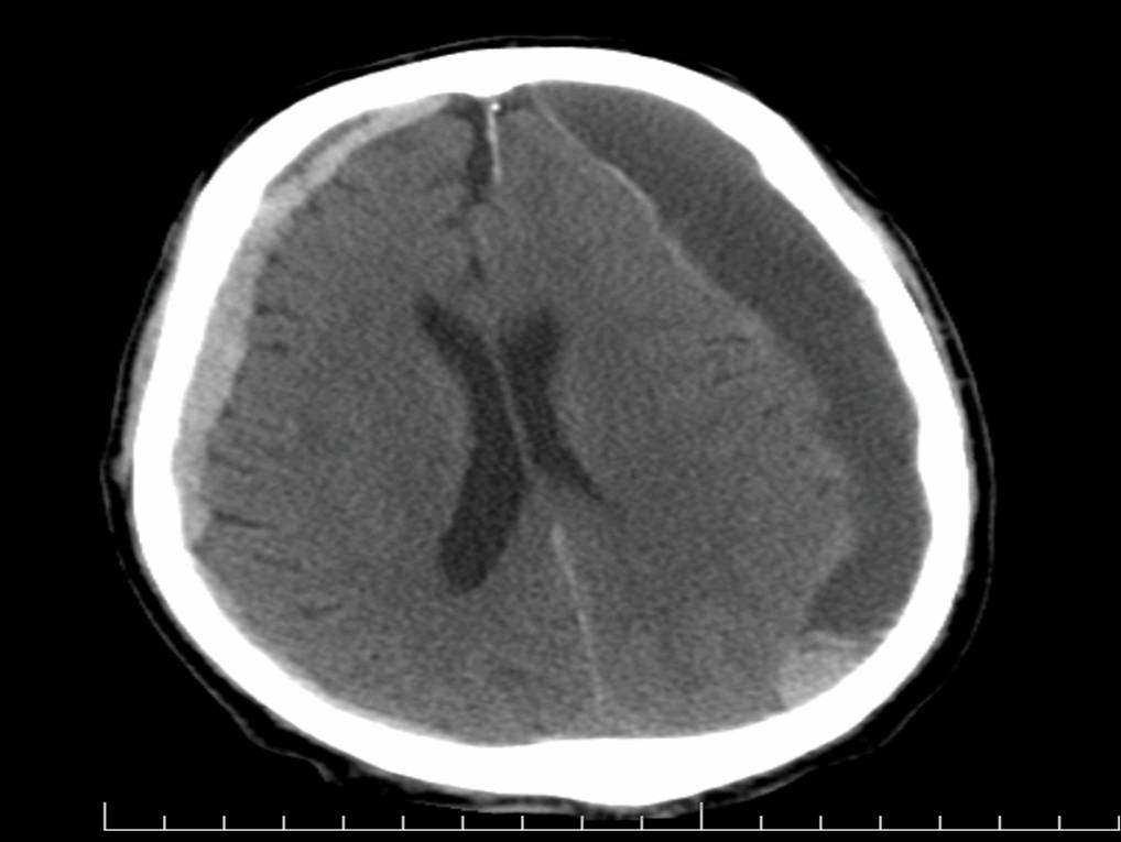 A 73-year-old woman is brought to the hospital with increasing confusion, gait deterioration, and headache. Physical examination reveals a contusion over the left temporal region. Her pulse is 109/min and blood pressure is 132/84 mm Hg. Pupils are 3 mm, round, and reactive. Neurologic examination reveals slurred speech and right-sided weakness. A noncontrast CT scan of the head is shown.