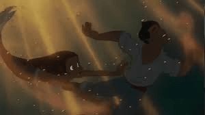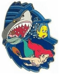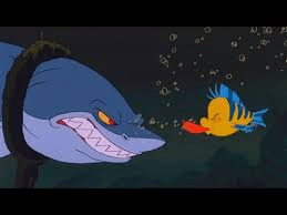 When Ariel and Flounder are exploring a ship wreck, a shark sees them and starts to chase them. Flounder and Ariel trick the shark by getting it to try and swim through a small hole, where it gets stuck.