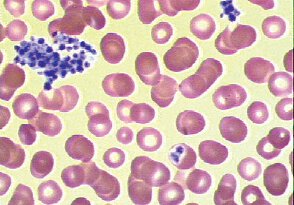 Pseudothrombocytopenia is an artifact in which platelets agglutinate and the clumped platelets are not recognized by automated blood counters. In this situation, the large platelet clumps (arrow) may be seen on the stained blood film. These clumps occasionally adhere to neutrophils but may also be unassociated with any other cell types.