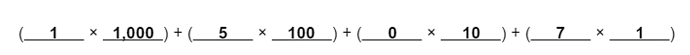 (7x100,000) + (0x10,000) + (3x1,000) + (4x100) + (4x10) + (4x1)