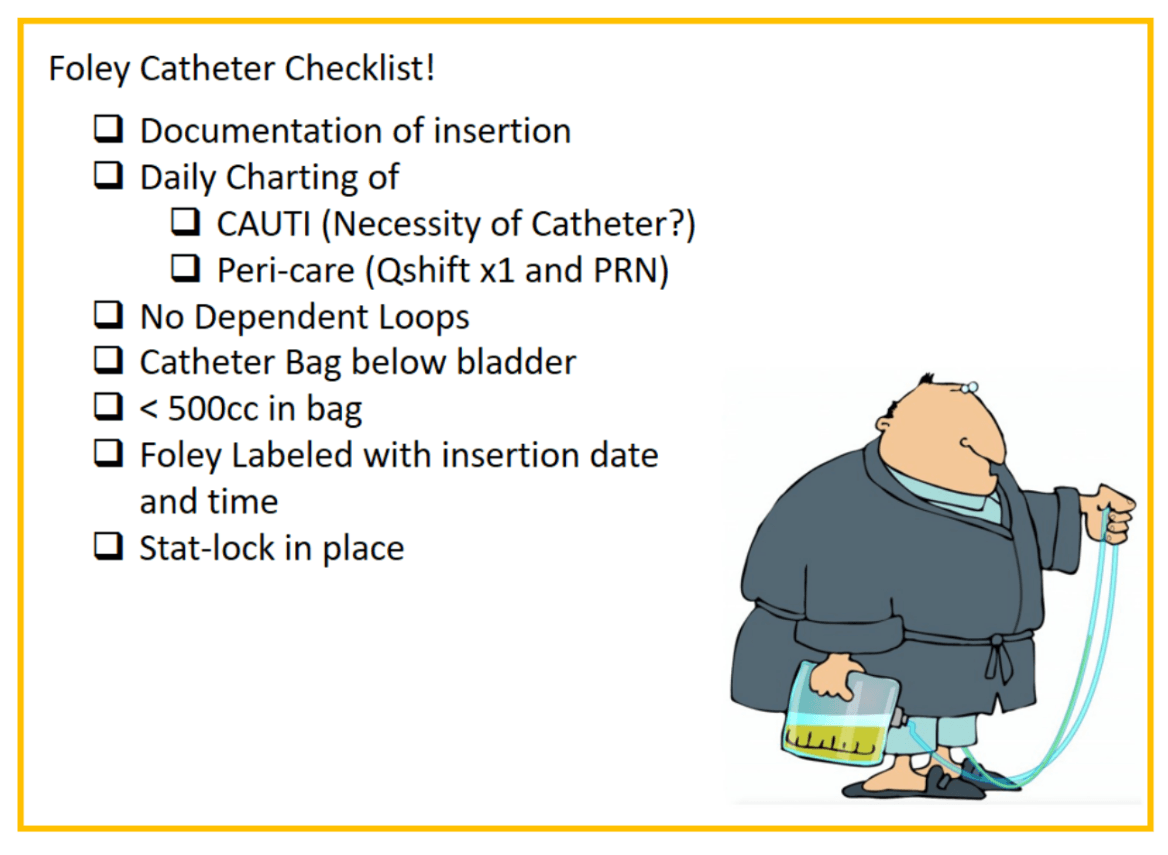 Catheter Care (use Foley wipes or Soap & Water ONLY never foam cleanser)