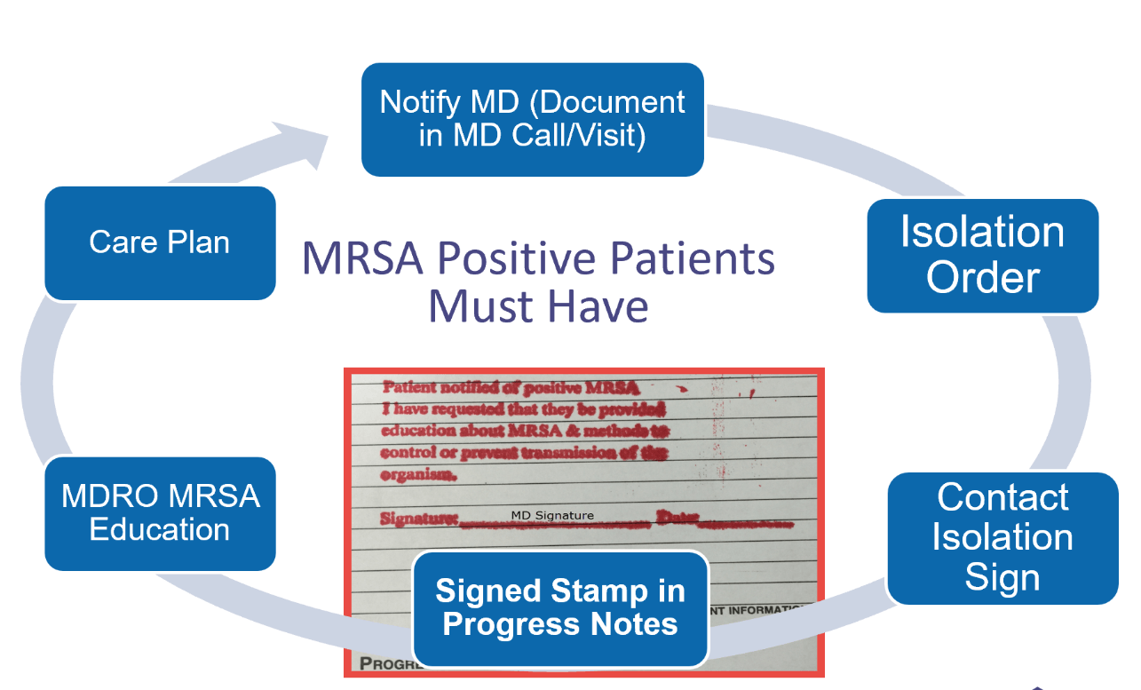 State of CA, federal and CDC regulations all guide our management of patients positive for MRSA