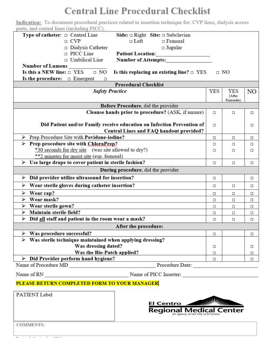 CLIP sheet (Central Line Insertion Procedural Checklist)