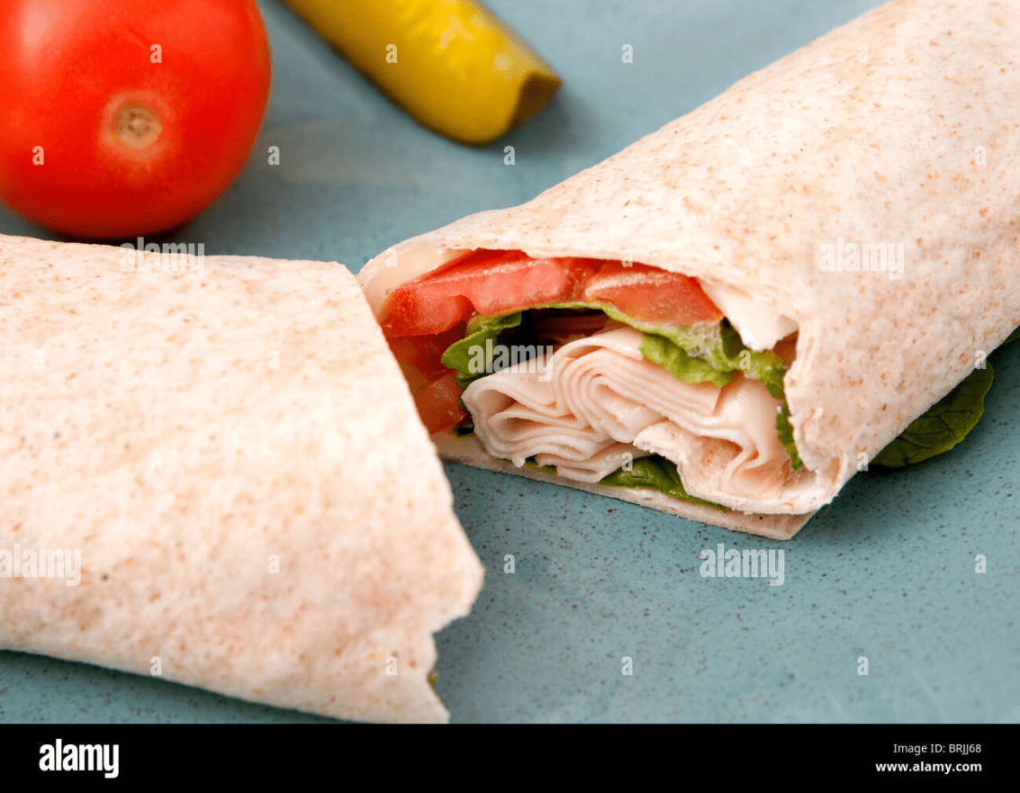 Turkey, lettuce, tomato, cheese, tortilla