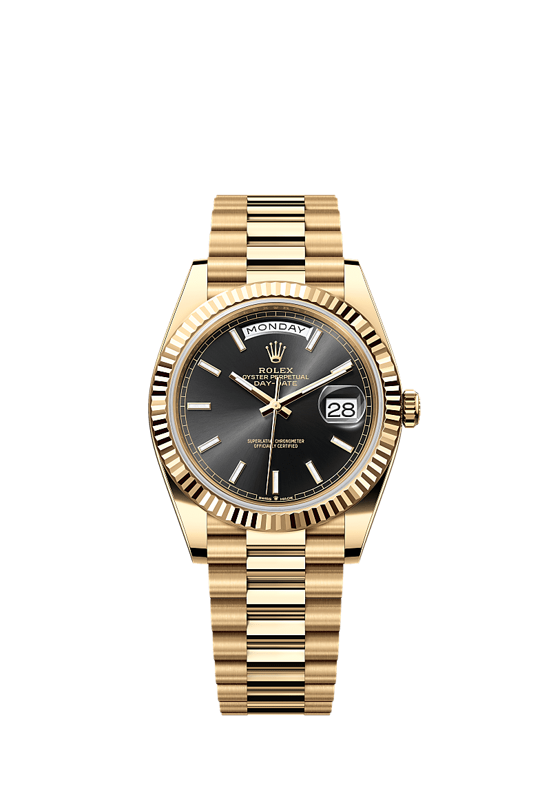 Day-Date 40 (oro giallo, lunetta zigrinata, quadrante scuro)