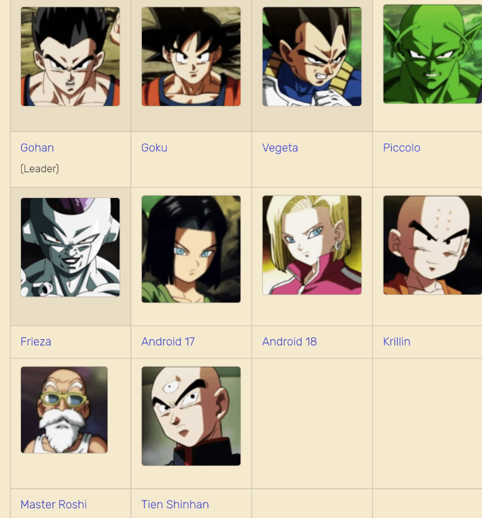 Yajirobi , Yamcha, android 18 , trunks, piccolo, Mr Satan, Majin boo, bulma, goten, Vegeta, Roshi, Gohan, krillin, goku, zamasu