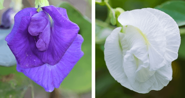 A pea plant has purple flowers. The pea plant reproduces, and its offspring has white flowers. The parent pea plant and its offspring are shown below.