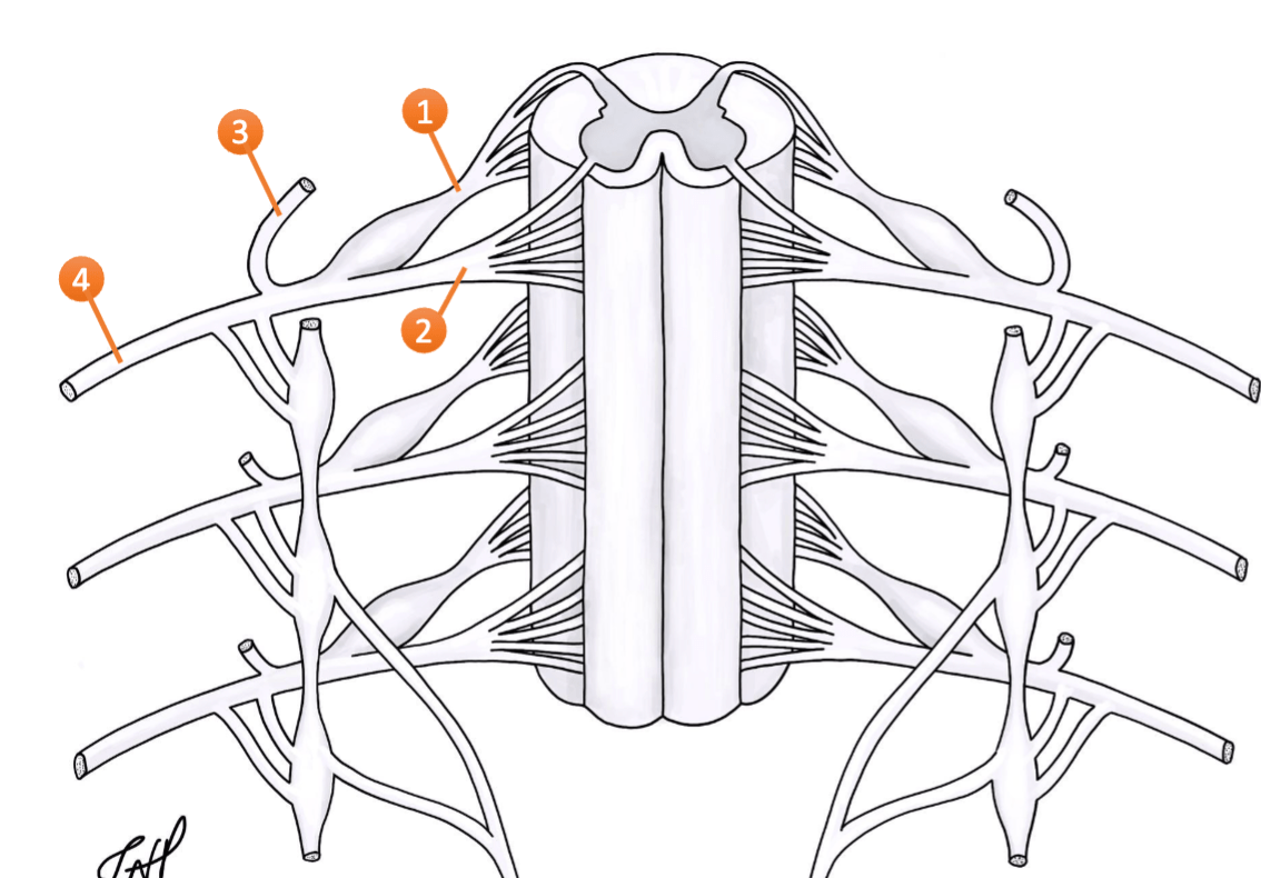 The structure in number 2 has cell bodies in what location of the spinal cord