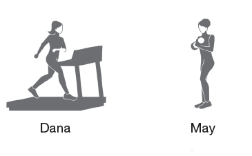 Dane is walking/running on a treadmill and May is lifting weights (working out).
