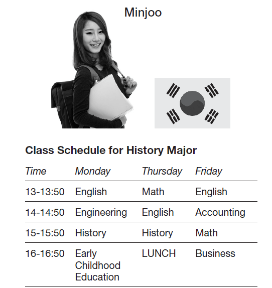 She / Minjoo has English on  Monday and Friday at 13:00 - 13:50.