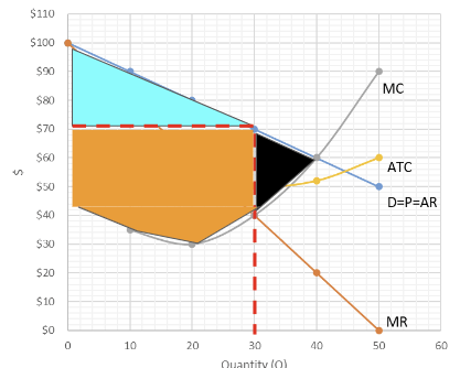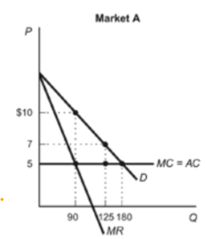 Method: you want to find the point of intersection of MC=MR. Then, you want to go up on the same line (at Q=90) until you get to the Demand curve "D". What's the corresponding price there? 10!