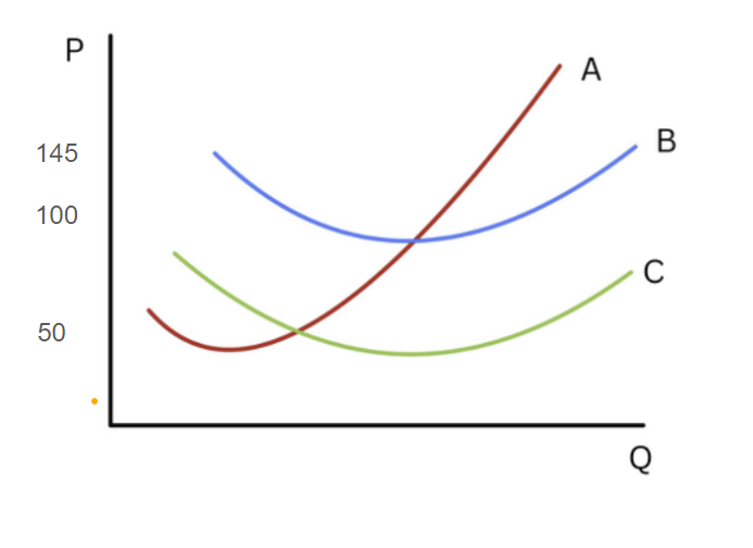 In the short run, if a perfectly competitive firm has production costs summarized by the cost curves below, what price range will it produce more than zero units?