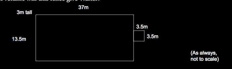 Walter needs a new fence to replace his old one that was broken in a storm. He needs a fence that is 13 meters wide, 37 meters long, and three meters tall. There’s also a part of the fence that branches out over a small pond, which is four meters wide and long. What volume will this fence give Walter?