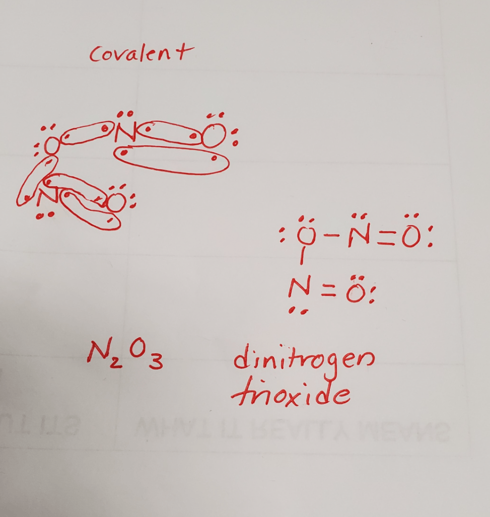 Determine the type of bond formed between nitrogen and oxygen and draw how the two elements come together to form a compound.  Write the structure, formula and name the compound.
