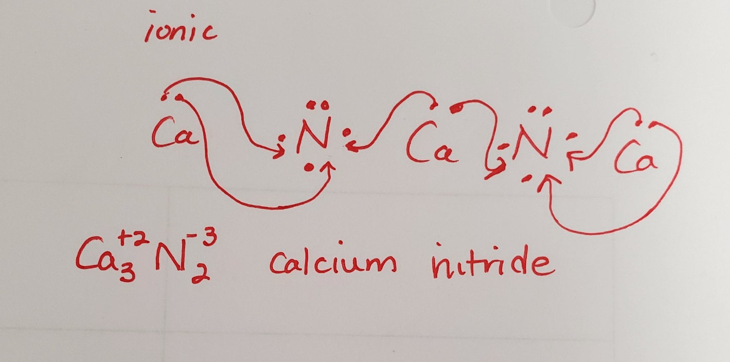 Determine the type of bond formed between calcium and nitrogen and draw how the two elements come together to form a compound.  Write the formula and name the compound.