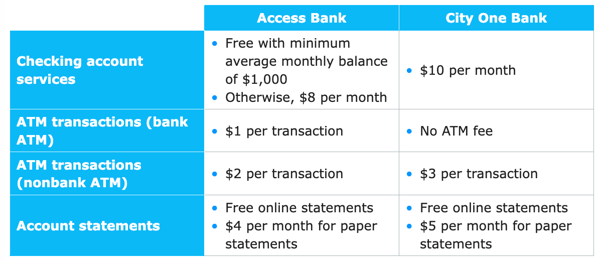 Brett is going to college and wants to open a checking account. He plans to keep an average balance of about $500 in the account. He plans to use a bank ATM 4 times each month. Brett prefers paper statements to help him manage his money. Which bank is the better choice for Brett?