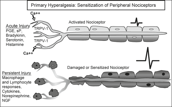 This process happens when the nerve endings are sensitized by the products of damaged cells, leading to pain that is unproportional to the stimulus.