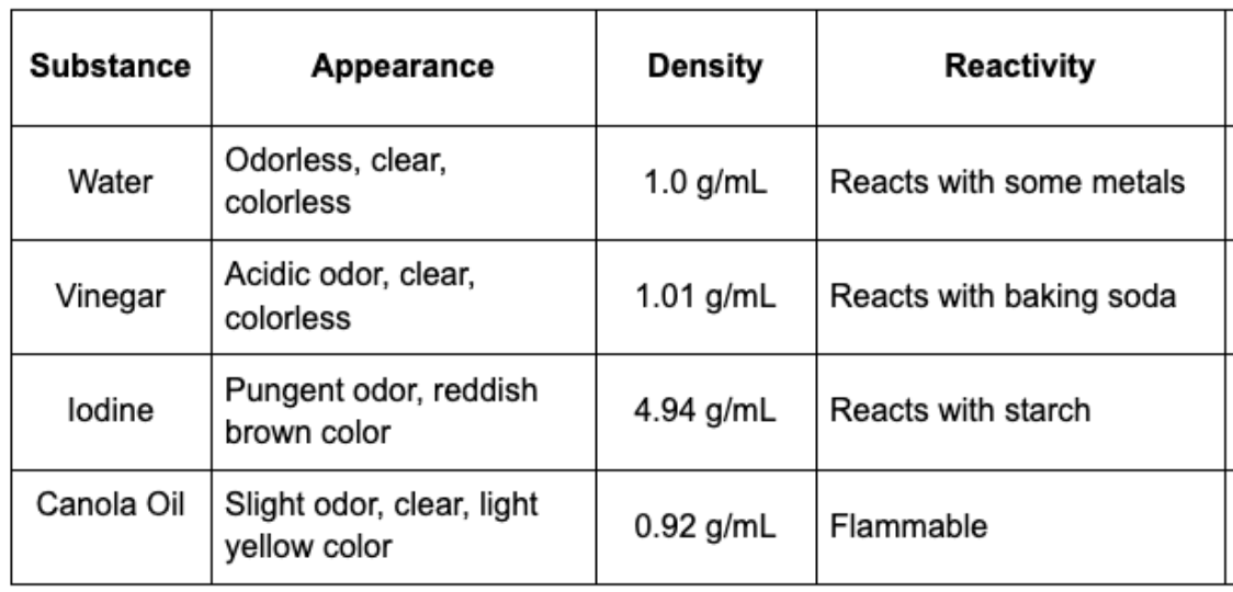 Examples include density, hardness, conductivity, magnetism, luster, mass, volume, and solubility.