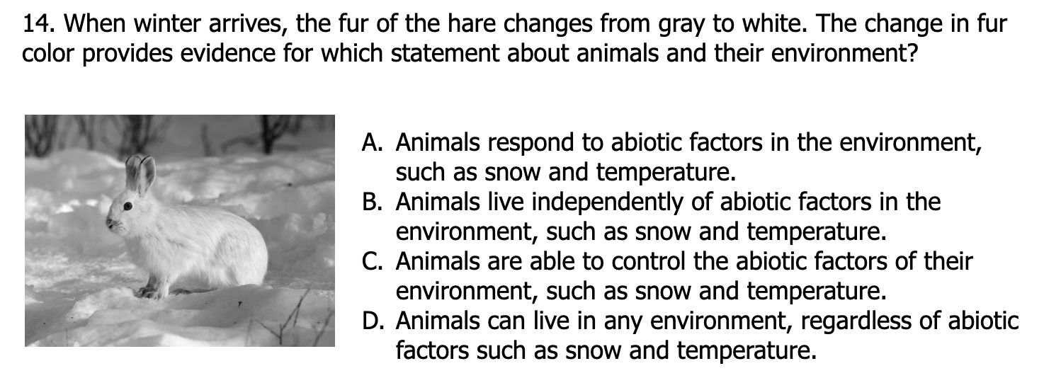 A. Animals respond to abiotic factors in the environment, such as snow and temperature.