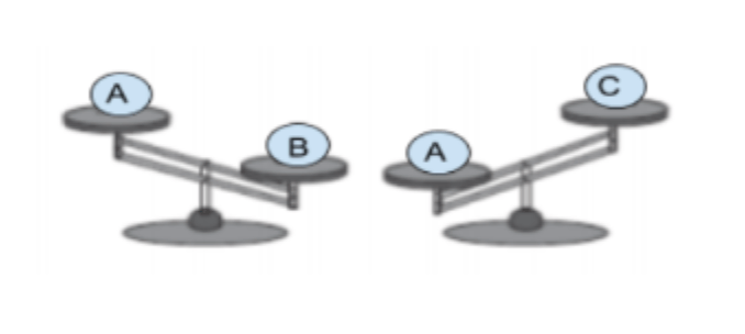 An adult was asked to compare the masses of three objects that were all the same size but made of different materials. A balance beam was used to compare the masses.