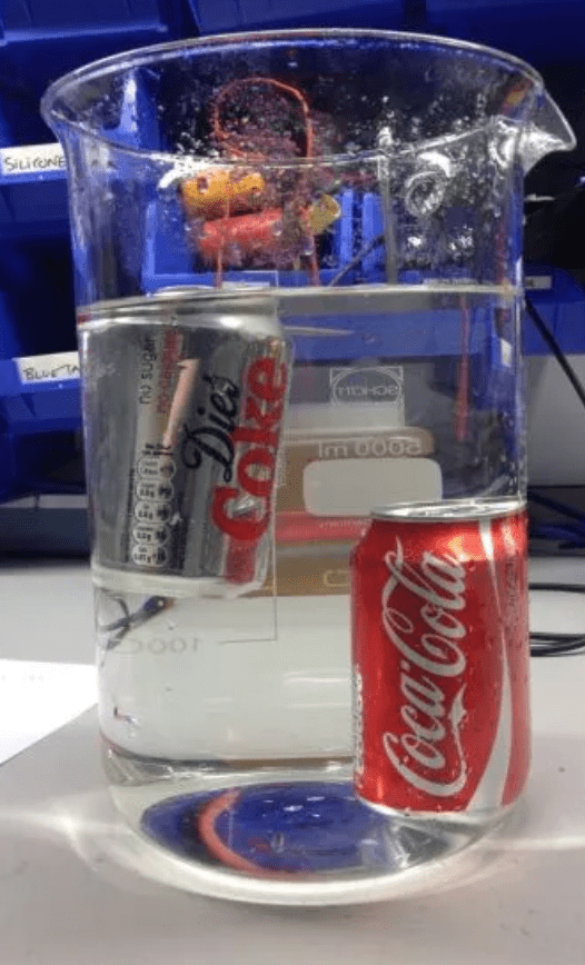 Compare the relative densities of a diet soda and a regular soda based on the picture.