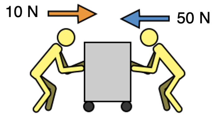 Because the difference between the two forces is 40N, the cart will go to the left with a net force of 40N.