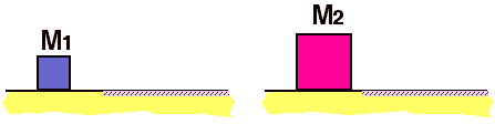Two blocks, M2 > M1, having the same kinetic energy move from a frictionless surface onto a surface having friction coefficient 𝜇k. Which goes further before stopping?