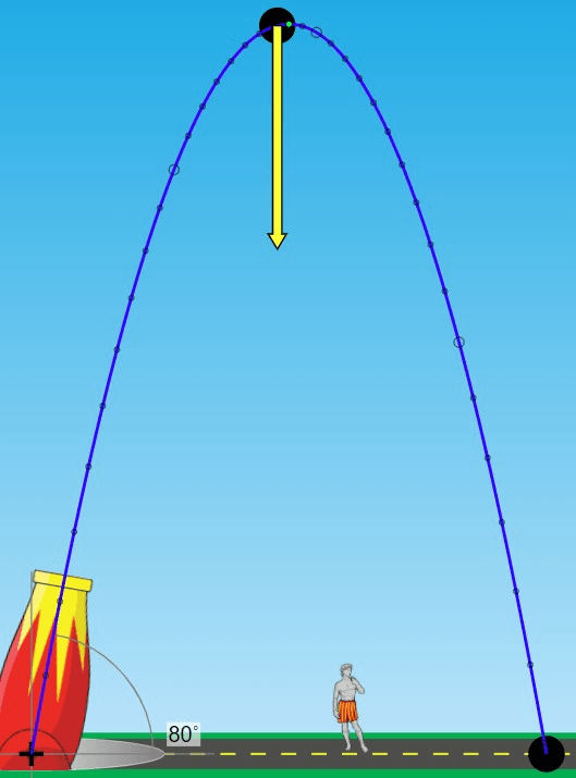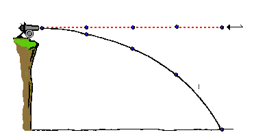 A cannonball is launched horizontally at 80 m/s and follows the black line trajectory below. How far VERTICALLY has the cannonball gone after 2 seconds?   (you need to use kinematics; )