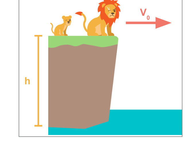 A one-eyed lion is out playing with his cubs. The lion decides to horizontally run off a 10-meter cliff with a speed of 12 m/s into some water. At the same time one of the cubs decide to follow, horizontally running off the same cliff with a speed of 4 m/s.