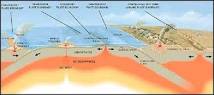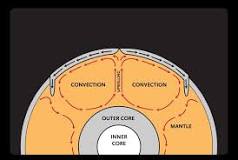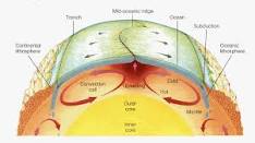 Convection currents in the magma drive plate tectonics. Heat generated from the radioactive decay of elements deep in the interior of the Earth creates magma (molten rock) in the asthenosphere. The aesthenosphere (70 ~ 250 km) is part of the mantle, the middle sphere of the Earth that extends to 2900 km.