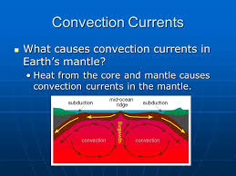In astronomy convection currents occur in the mantle of the Earth, and presumably some other planets, and the convection zone of the sun. Inside of the Earth, magma is heated near the core, rises toward the crust, then cools and sinks back toward the core.