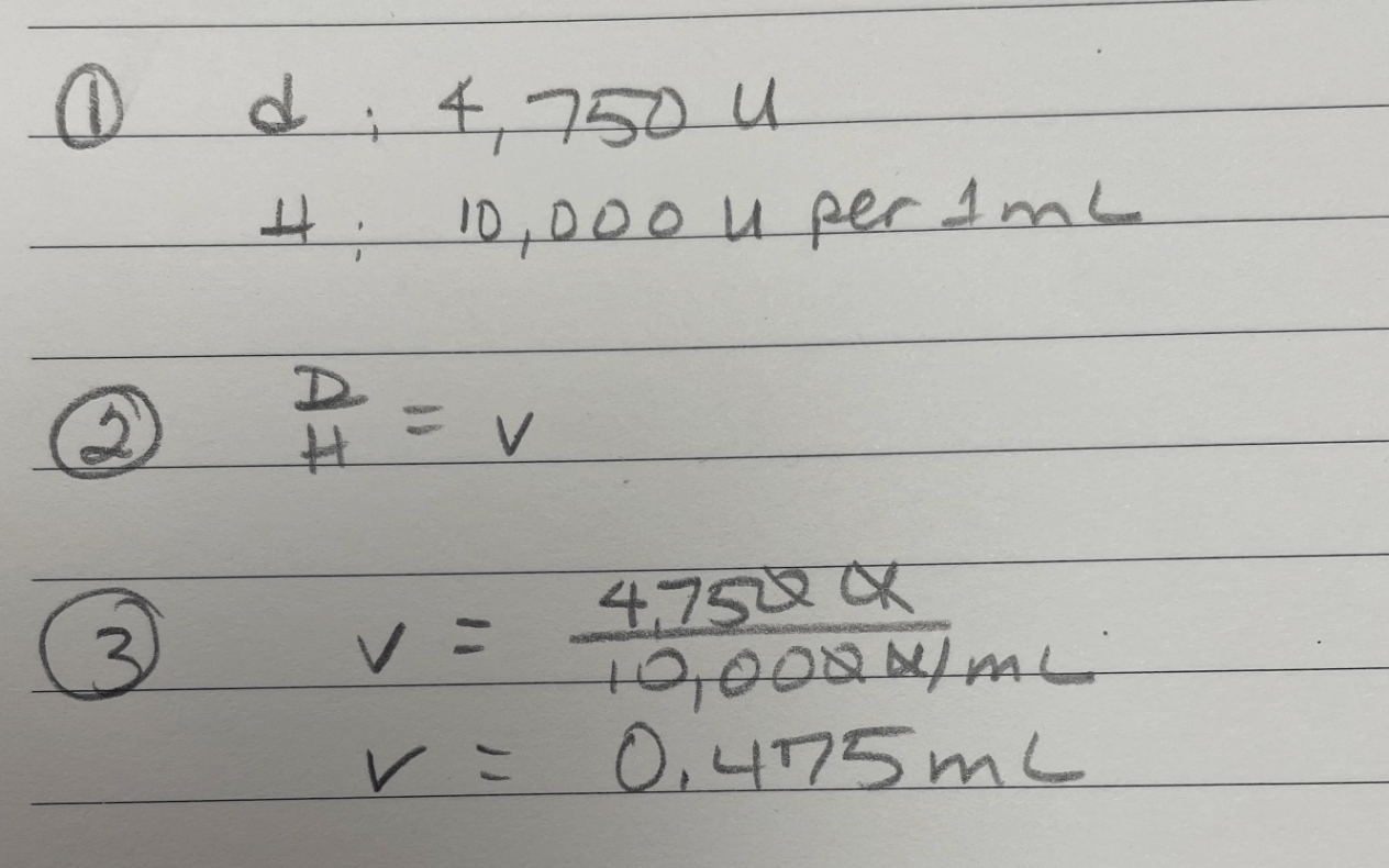 The amount of Heparin to administer in milliliters if the order is for 4,750 units subQ and the available concentration is 10,000 units per 1 mL.
