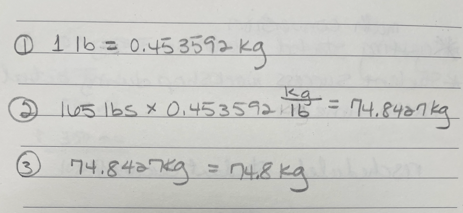 An adult patient weighs 165 pounds. This is their weight in kilograms, rounded to the nearest tenth.