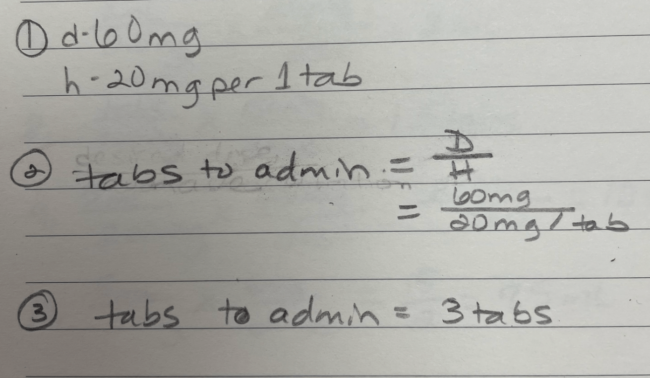 A physician orders Furosemide 60 mg PO. The available medication is 20 mg per tablet. This is how many tablets the nurse will administer.