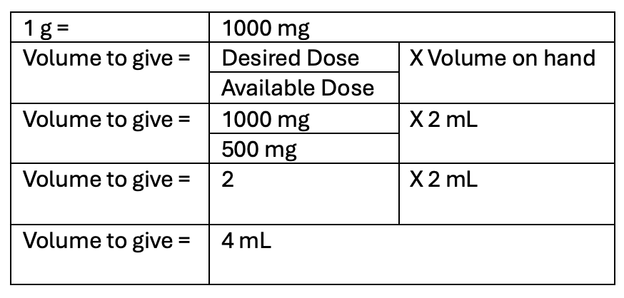 An order calls for Ampicillin 1 gram IV push. The vial contains Ampicillin 500 mg reconstituted in 2 mL of sterile water. Calculate the volume in milliliters the nurse will draw up.