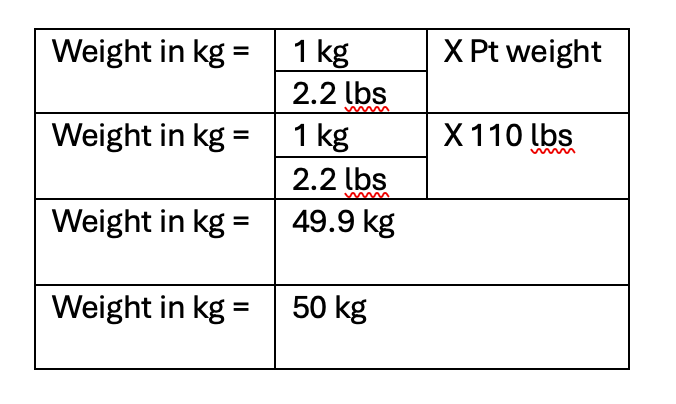 A patient weighs 110 pounds. Calculate their weight in kilograms.