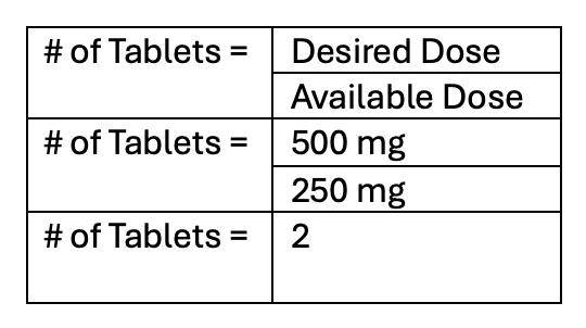 A patient needs 500 mg of Tylenol. The stock medication is available in 250 mg tablets. Calculate the number of tablets the nurse will administer.
